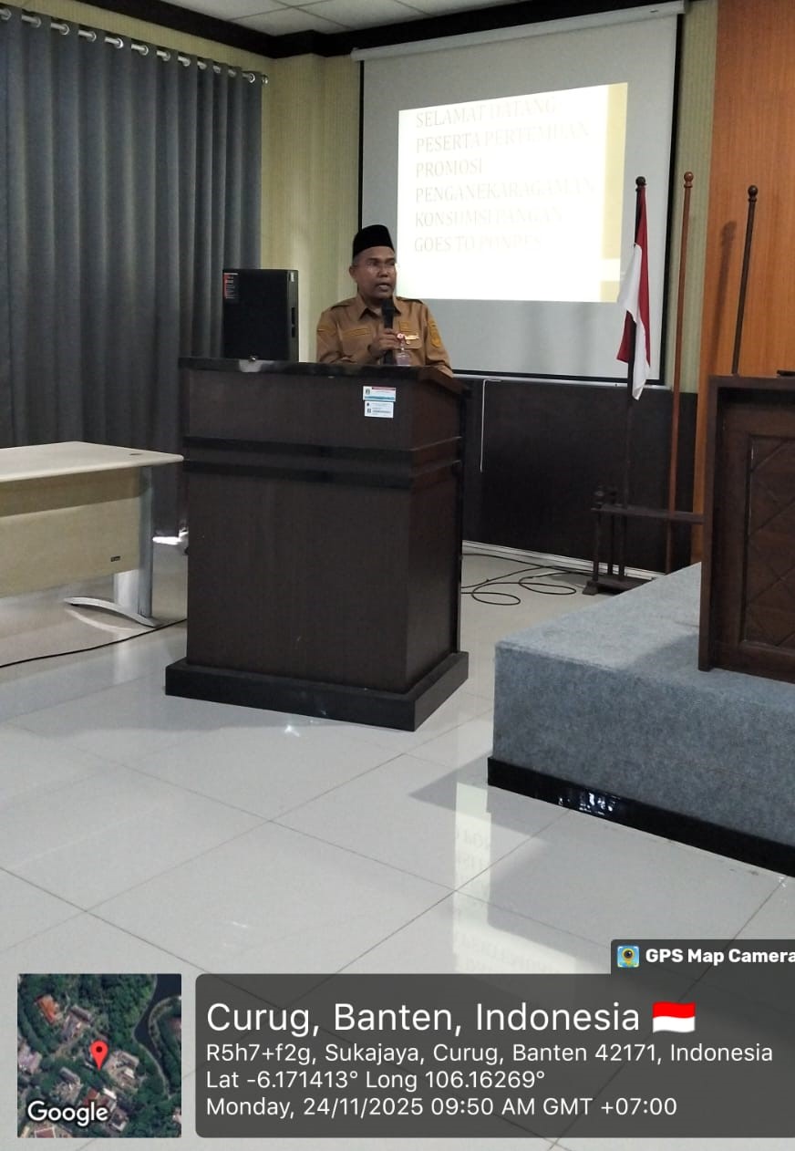 Serang, 24 November 2025 — Dinas Ketahanan Pangan Provinsi Banten kembali menggelar kegiatan Pertemuan Promosi Penganekaragaman Konsumsi Pangan – Goes to Ponpes sebagai upaya memperluas edukasi pangan Beragam,Bergizi Seimbang, dan Aman (B2SA) ke lingkungan pondok pesantren. Kegiatan yang berlangsung di Aula Dinas Ketahanan Pangan Provinsi Banten, Kecamatan Curug, Kota Serang ini dihadiri oleh berbagai pemangku kepentingan dari tingkat provinsi hingga daerah.