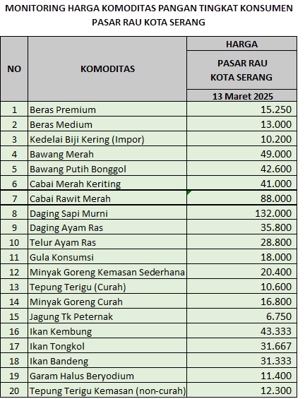 Pada saat Monitoring Harga dan Pasokan Komoditas Pangan Strategis pada tanggal 12 Maret 2025 di Pasar Rau Kota Serang harga 20 (dua puluh) komoditas terpantau sebagai berikut :