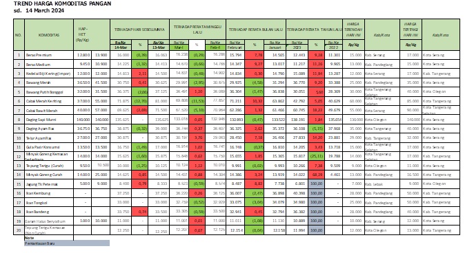 Pada Hari Kamis Minggu kedua Bulan Maret, dari 20 komoditas apabila melihat rata-rata minggu lalu terdapat 11 komoditas yang mengalami sedikit kenaikan harga dibanding harga pada minggu lalu yaitu 1. Bawang Putih Bonggol, 2. Dagig sapi murni, 3. Daging ayam ras, 4. Telur ayam ras, 5. Gula pasir konsumsi, 6. Minyak Goreng Kemasan Sederhana, 7. Tepung Terigu Curah, 8. Minyak Goreng Curah, 9. Ikan kembung, 10. Garam halus beryodium 11. Tepung terigu kemasan (Non curah) kenaikan paling tinggi adalah di komoditas Teur ayam ras sebesar 3,76% (harga sebelumnya Rp. 29.063 menjadi Rp. 30.197) Harga tertinggi berada di Kota Serang dan terendah di Kab Tangerang. Sementara untuk harga yang turun (penurunan harga) ada 9 komoditas yaitu: 1. Beras premium, 2. Beras nedium, 3. Kedelai biji kering (import), 4. Bawang merah, 5. Cabai merah keriting, 6. Cabai rawit merah, 7. Jagung Tk Peternak, 8. Ikan tonkol dan 9. Ikan bandeng. Penurunan Harga yang paling rendah adalah komoditas Cabai Merah kriting sebesar 11,53% (harga sebelumnya adalah Rp. 77.857 menjadi Rp. 69.808) dengan harga terendah di Kota Tangerang Selatan dan Harga tertinggi di Kota Tangerang.
