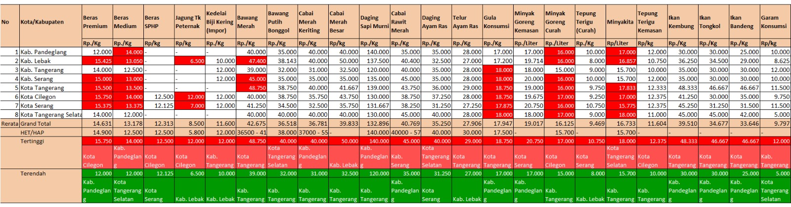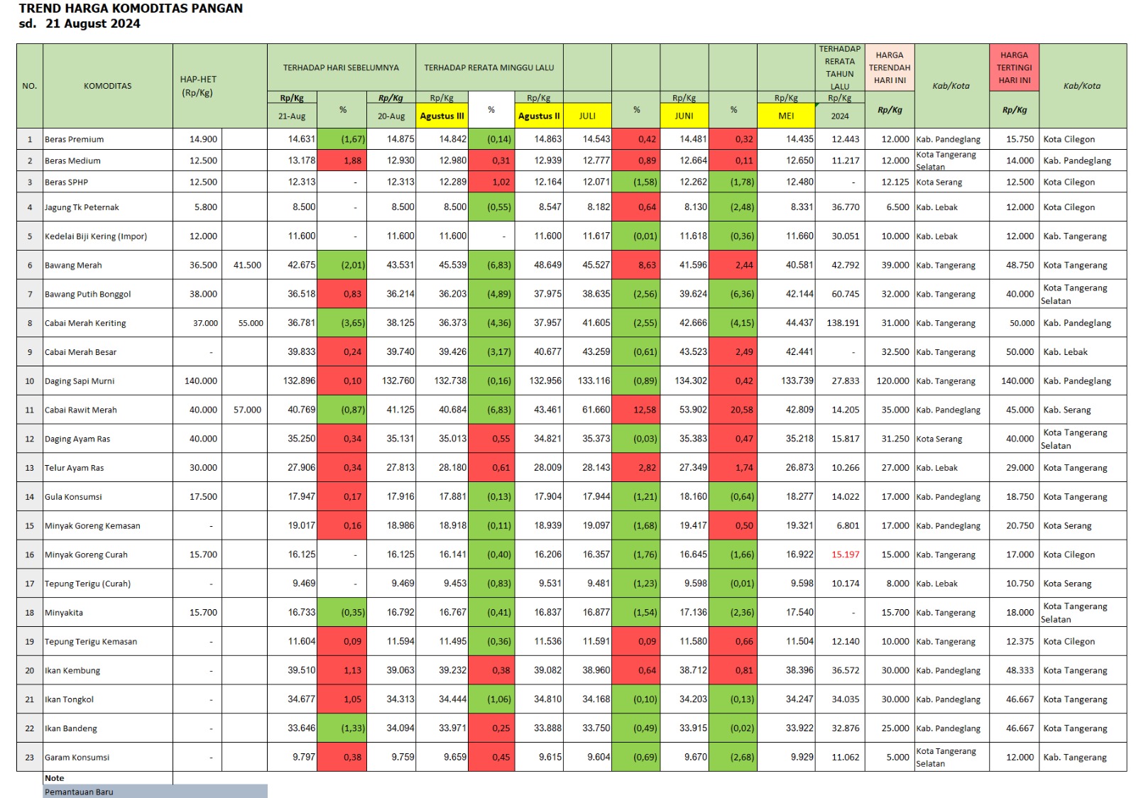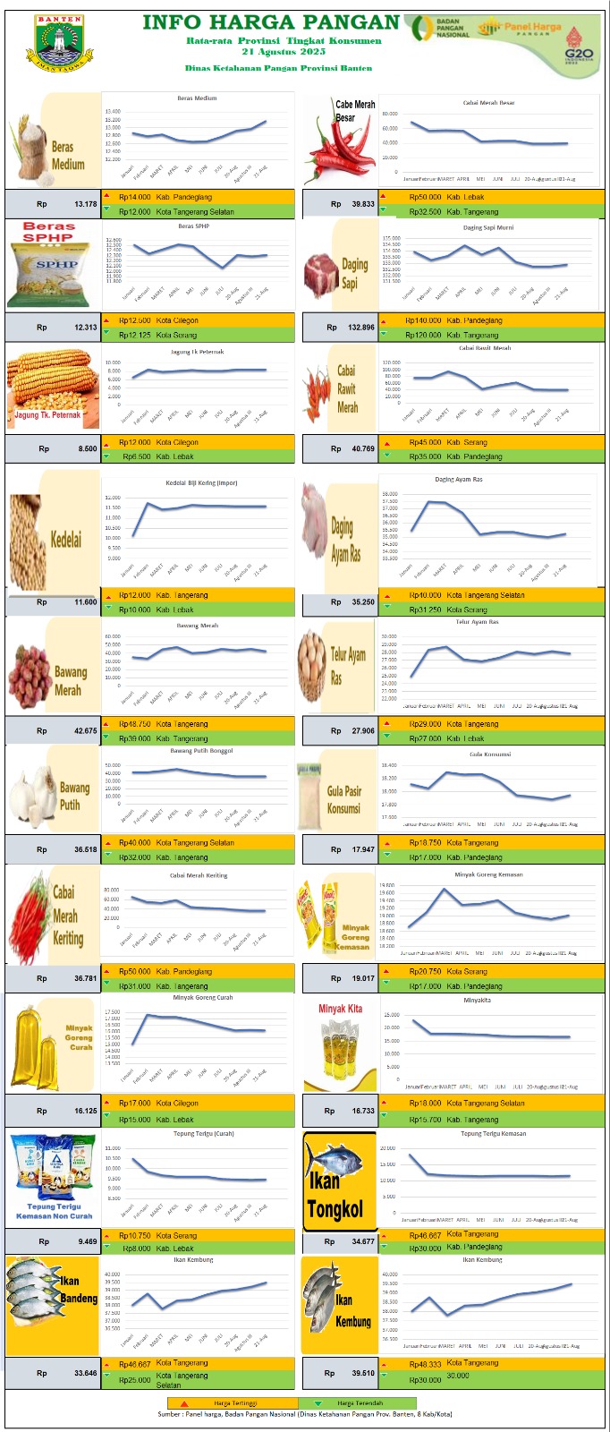 Pada Hari Kamis Minggu Ketiga Bulan Agustus, dari 23 komoditas apabila melihat ratarata minggu lalu terdapat 7 komoditas yang mengalami kenaikan harga dibanding harga pada minggu lalu yaitu 1. Beras premium, 2. Beras SPHP, 3. Daging Ayam Ras, 4. Telur Ayam Ras, 5. Ikan Kembung, 6. Ikan Bandeng dan 7. Garam Konsumsi Kenaikan paling tinggi adalah Komoditas Beras SPHP sebesar 1,02% harga sebelumnya Rp. 12.164 menjadi Rp. 12.289 Harga tertinggi berada di Kota Cilegon dan terendah di Kota Serang. Sementara untuk harga yang turun (penurunan harga) ada 15 komoditas yaitu: 1. Beras Medium, 2. Jagung Tk Peternak, 3. Bawang Merah, 4. Bawang Putih Bonggol, 5. Cabai Merah Keriting, 6. Cabai Merah Besar, 7. Daging Sapi Murni, 8. Cabai Rawit Merah, 9. Gula Konsumsi, 10. Minyak goreng Kemasan, 11. Minyak goreng Curah, 12. Tepung Terigu (Curah), 13. Minyak Kita, 14. Tepung Terigu Kemasan, 15. Ikan Tongkol, Penurunan Harga yang paling signifikan adalah komoditas Cabai Rawit Merah sebesar 6,83% harga sebelumnya adalah Rp 43.461 menjadi Rp. 40.684 dengan harga tertinggi di Kabupaten Serang dan Harga terendah di Kabupaten Pandeglang. Sedangkan Komoditas Kedelai Biji Kering (Impor) mengalami harga yang stabil.