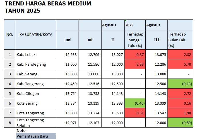 Apabila melihat trend harga Beras Medium minggu ketiga Bulan Agustus dibandingkan dengan harga Minggu kedua Bulan Agustus, Kab Kota yang mengalami penurunan harga adalah Kota Serang sebesar 0,40% dari harga Rp. 13.393 menjadi Rp. 13.339. sedangkan Kab Kota yang mengalami kenaikan harga adalah Kabupaten Lebak, Kabupaten Pandeglang dan Kota Tangerang, dengan kenaikan paling signifikan ada di Kabupaten Pandeglang sebesar 2,33% dari Rp. 12.000 menjadi Rp.12.286, sedangkan Kab Kota Lainya mengalami harga yang stabil.