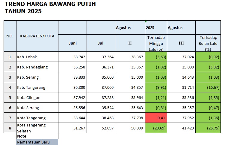 Apabila melihat Apabila melihat trend harga Bawang Putih minggu ketiga Bulan Agustus dibandingkan dengan harga Minggu kedua Bulan Agustus, terdapat kenaikan harga di Kabupaten Pandeglang, Kota Serang dan Kota Tangerang Selatan dengan kenaikan signifikan ada di Kota Tangerang sebesar 0,41% dari harga Rp. 37.798 menjadi Rp. 37.952. Sedangkan Penurunan harga ada Kabupaten Lebak, Kabupaten Pandeglang, Kabupaten Serang, Kabupaten Tangerang, Kota Cilegon, Kota Serang dan Kota Tangerang Selatan dimana penurunan paling signifikan ada di Kota Tangerang Selatan sebesar 20,69% dari Rp. 50.000 menjadi Rp. 41.429 dan untuk kab kota lainnya mengalami harga yang stabil.