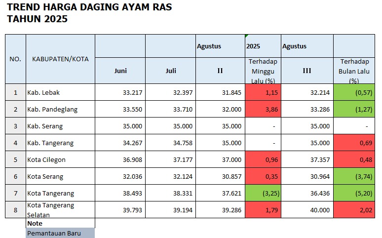 Apabila melihat Apabila melihat trend harga Daging ayam minggu ketiga Bulan Agustus dibandingkan dengan harga Minggu kedua Bulan Agustus, Kabupaten/Kota yang mengalami penurunan harga ada di Kota Tangerang dengan penurunan Sebesar 3,25% dari harga Rp. 37.621 menjadi Rp. 36.436, Sedangkan penurunan harga terjadi di Kabupaten Lebak, Kabupaten Pandeglang, Kota Cilegon, Kota Serang dan Kota Tangerang Selatan dimana penurunan harga paling signifikan ada di Kabupaten Pandeglang sebesar 3,25% dari harga Rp. 37.621 menjadi Rp. 36.436. Sedangkan Kabupaten Kota lainnya mengalami harga yang stabil.