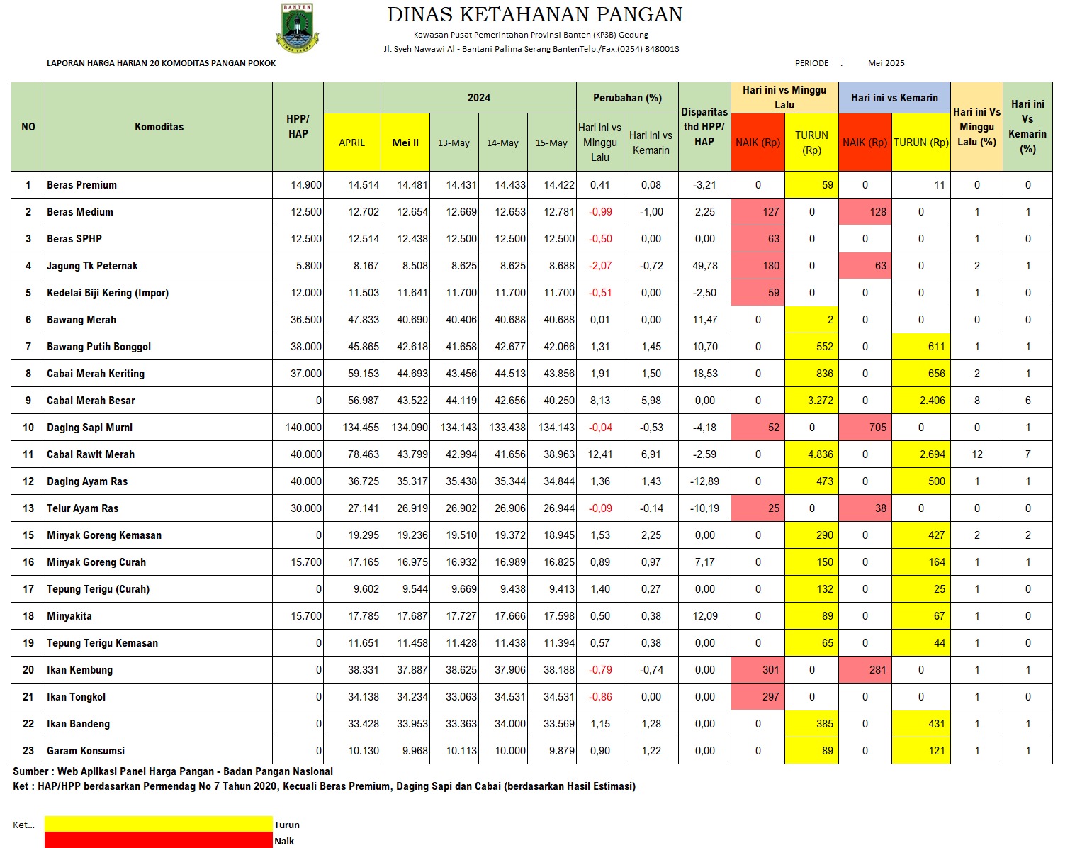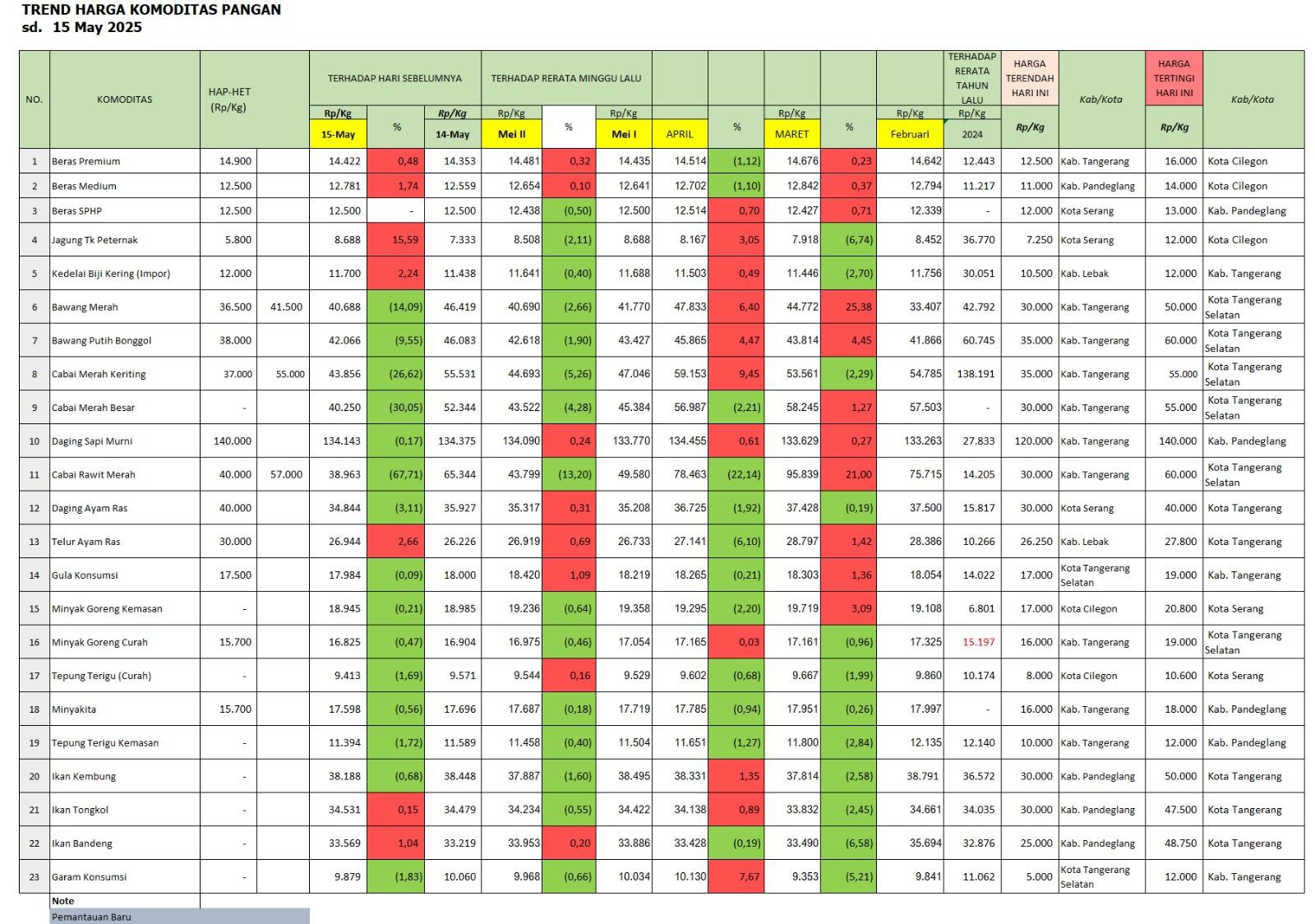 Dilihat dari laporan harian, hari Kamis 15 Mei 2025 dibanding dengan hari Rabu 14 Mei 2025 terdapat 5 komoditas yang mengalami kenaikan dan 12 komoditas penurunan, kenaikan yang paling signifikan adalah Komoditas Ikan Kembung hingga Rp. 281 atau 0,74% dari hari kemarin Sedangkan komoditas yang mengalami penurunan signifikan adalah Komoditas Cabai Rawit Merah sebesar Rp 2.694. Atau sebesar 2,59% dari harga sebelumnya. Sedangkan komoditas lainnya mengalami harga yang stabil.
