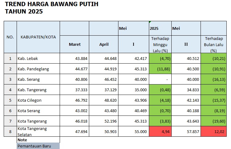Apabila melihat Apabila melihat trend harga Bawang Putih minggu Kedua Bulan Mei dibandingkan dengan harga Minggu Kedua Bulan Mei, Untuk kenaikan harga terdapat Tangerang Selatan sebesar 4,94% dari harga Rp. 55.000 menjadi Rp.57.857. Sedangkan Penurunan harga ada di Kabupaten Lebak, Kab Pandeglang, Kab Tangerang, Kota Cilegon, Kota Serang dan Kota Tangerang dimana penurunan paling signifikan ada di Kab Pandeglang sebesar 11,88% dari Rp. 45.313 menjadi 40.500 untuk Kab/Kota lainnya mengalami harga yang stabil.