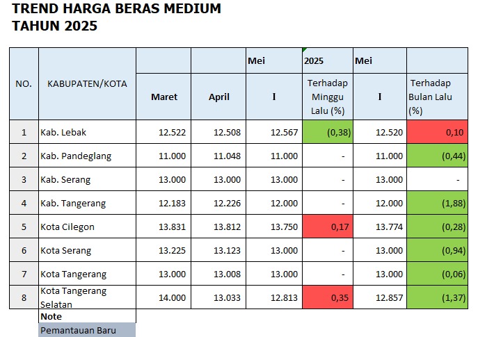 Apabila melihat trend harga Beras Medium minggu Kedua Bulan Mei dibandingkan dengan harga Minggu Kedua Bulan Mei, Kab Kota yang mengalami kenaikan harga adalah Kota Cilegon dan Kota Tangerang Selatan dimana kenaikan Kota Cilegon sebesar 0,17% dari harga Rp. 13.750 ke Rp. 13.774 di Kota Tangerang Selatan dengan Kenaikan di Sebesar 0,35% dari harga Rp. 12.813 menjadi Rp. 12.857. Sedangkan Kab Kota yang mengalami penurunan harga Kab Lebak sebesar 0,38% dari harga Rp. 12.567 menjadi Rp. 12.520, sedangkan Kab Kota Lainya mengalami harga yang stabil.