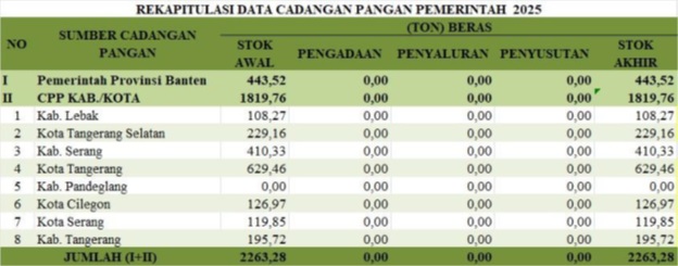 Tahun 2025 Pemerintah Provinsi Banten melalui Dinas Ketahanan Pangan, akan mengadakan Cadangan Pangan Berupa daging dan Unggas masing – masing 11 Ton, sedangkan stok Cadangan Pangan Berupa Beras Provinsi Banten Per 31 Desember 2024 sebanyak 443.521 Kg.