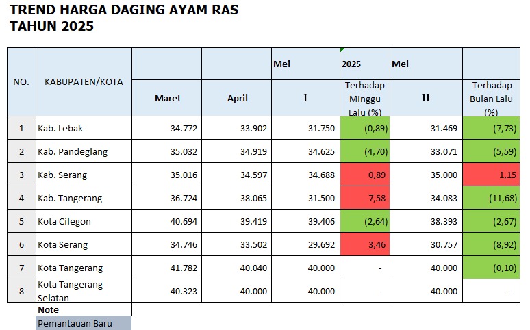 Apabila melihat Apabila melihat trend harga Daging ayam minggu Kedua Bulan Mei dibandingkan dengan harga Minggu Kedua Bulan Mei, Kabupaten/Kota yang mengalami kenaikan harga adalah Kabupaten Serang, Kabupaten Tangerang dan Kota Serang dengan kenaikan signifikan di Kabupaten Tangerang Sebesar 7,58% dari harga Rp. 31.500 menjadi Rp. 34.083, Sedangkan penurunan harga terjadi di Kab Lebak, Kab Pandeglang dan Kota Cilegon Dimana penurunan paling signifikan ada di Kab Tangerang sebesar 7,58% dari harga Rp. 31.500 menjadi Rp. 34.083. Sedangkan Kab Kota lainnya mengalami harga yang stabil.