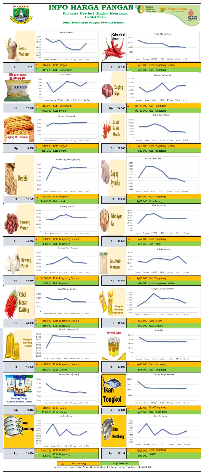 Pada Hari Kamis Minggu Kedua Bulan Mei, dari 23 komoditas apabila melihat rata-rata minggu lalu terdapat 8 komoditas yang mengalami kenaikan harga dibanding harga pada minggu lalu yaitu 1. Beras Premium, 2. Beras Medium, 3. Daging Sapi Murni, 4. Daging Ayam Ras, 5. Telur Ayam Ras, 6. Gula Konsumsi, 7. Tepung Terigu (Curah), 8. Ikan Bandeng Kenaikan paling tinggi adalah Komoditas Gula Konsumsi sebesar 1,09% harga sebelumnya Rp. 18.219 menjadi Rp. 18.420 Harga tertinggi berada di Kota Tangerang Selatan dan terendah di Kabupaten Tangerang. Sementara untuk harga yang turun (penurunan harga) ada 15 komoditas yaitu: 1. Beras SPHP, 2. Jagung Tk Peternak, 3. Kedelai Biji Kering (Impor), 4. Bawang Merah, 5. Bawang Putih Bonggol, 6. Cabai Merah Keriting, 7. Cabai Merah Besar, 8. Cabai Rawit Merah, 9. Minyak Goreng Kemasan, 10. Minyak Goreng Curah, 11. Minyak Kita, 12. Tepung Terigu Kemasan, 13. Ikan Kembung, 14. Ikan Tongkol, 15. Garam Konsumsi. Penurunan Harga yang paling signifikan adalah komoditas Cabai Rawit Merah sebesar 13,20% harga sebelumnya adalah Rp. 49.580 menjadi Rp. 43.799 dengan harga tertinggi di Kota Tangerang Selatan dan Harga terendah di Kabupaten Tangerang.