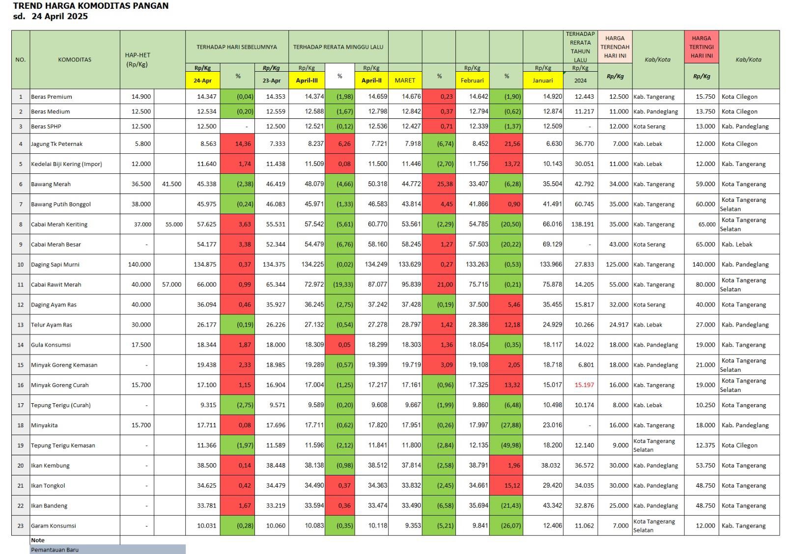 Dilihat dari laporan harian, hari Kamis 24 April 2025 dibanding dengan hari Rabu 23 April 2025 terdapat 13 komoditas yang mengalami kenaikan dan 7 komoditas penurunan, kenaikan yang paling signifikan adalah Komoditas Cabai Merah Keriting hingga Rp. 2.094 atau 55,74% dari hari kemarin Sedangkan komoditas yang mengalami penurunan signifikan adalah Komoditas Bawang Merah sebesar Rp. 1.081. Atau sebesar 24,21% dari harga sebelumnya. Sedangkan komoditas lainnya mengalami harga yang stabil.