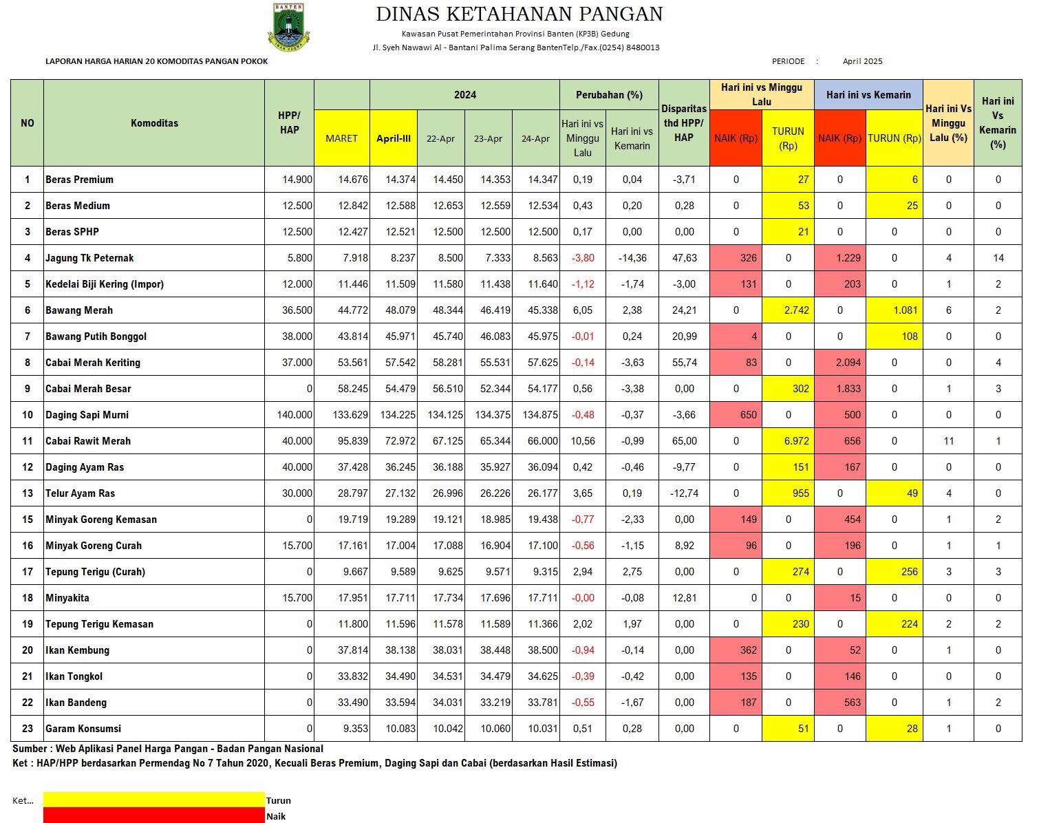 Pada Hari Kamis Minggu Ketiga Bulan April, dari 23 komoditas apabila melihat rata-rata minggu lalu terdapat 5 komoditas yang mengalami kenaikan harga dibanding harga pada minggu lalu yaitu 1. Jagung Tk Peternak, 2. Kedelai Biji Kering (Impor), 3. Gula Konsumsi, 4. Ikan Tongkol, 5. Ikan Bandeng. Kenaikan paling tinggi adalah Komoditas Jangung Tk Peternak sebesar 6,26% (harga sebelumnya Rp. 6.237 menjadi Rp. 7.421 Harga tertinggi berada di Kota Cilegon dan terendah di Kabupaten Lebak. Sementara untuk harga yang turun (penurunan harga) ada 18 komoditas yaitu: 1. Beras Premium, 2. Beras Medium, 3. Beras SPHP, 4. Bawang Merah, 5. Bawang Putih Bonggol, 6. Cabai Merah Keriting, 7. Cabai Merah Besar, 8. Daging Sapi Murni, 9. Cabai Rawit Merah, 10. Daging Ayam Ras, 11. Telur Ayam Ras, 12. Minyak Goreng Kemasan, 13. Minyak Goreng Curah, 14. Tepung Terigu (Curah), 15. Minyak Kita, 16. Tepung Terigu Kemasan, 17. Ikan Kembung, 18. Garam Konsumsi. Penurunan Harga yang paling signifikan adalah komoditas Cabai Rawit Merah sebesar 19,33% harga sebelumnya adalah Rp. 87.077 menjadi Rp. 72.972 dengan harga terendah di Kabupaten Tangerang dan Harga tertinggi di Kota Tangerang Selatan.