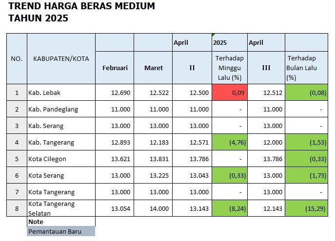 Apabila melihat trend harga Beras Medium minggu ketiga Bulan April dibandingkan dengan harga Minggu kedua Bulan April, Kab Kota yang mengalami kenaikan harga adalah Kab Lebak Kenaikan di Kab Lebak Sebesar 0,09% dari harga Rp. 12.5 00 menjadi Rp. 12.512. Sedangkan Kab Kota yang mengalami penurunan harga adalah Kabupaten Tangerang, Kota Serang dan Kota Tangerang Selatan dimana penurunan harga yang signifikan ada di Kota Tangerang Selatan sebesar 8,24% dari harga Rp. 13.143 menjadi Rp. 12.143, sedangkan Kab Kota Lainya mengalami harga yang stabil..
