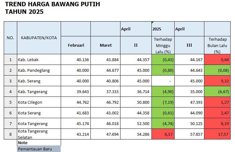 Apabila melihat Apabila melihat trend harga Bawang Putih minggu ketiga Bulan April dibandingkan dengan harga Minggu kedua Bulan April, Untuk kenaikan harga terdapat di Kota Tangerang Selatan dengan kenaikan sebesar 19,89% dari harga Rp. 54.286 menjadi Rp.57.857. Sedangkan Penurunan harga ada di Kabupaten Lebak, Kabupaten Pandeglang, Kabupaten Tangerang, Kota Cilegon, Kota Serang, Kota Tangerang dan Kota Tangerang Selatan dimana penurunan paling signifikan ada di Kota Cilegon sebesar 7,19% dari Rp. 51.800 menjadi 47.393 untuk Kab/Kota lainnya mengalami harga yang stabil.