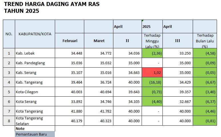 Apabila melihat Apabila melihat trend harga Daging ayam minggu ketiga Bulan April dibandingkan dengan harga Minggu kedua Bulan April, Kabupaten/Kota yang mengalami kenaikan harga adalah Kab dengan kenaikan Sebesar 1,02% dari harga Rp. 34.463 menjadi Rp. 35.000, Sedangkan penurunan harga terjadi di Kab Lebak, Kab Tangerang, Kab Tangerang, Kota Cilegon dan Kota Serang Dimana penurunan paling signifikan ada di Kab Tangerang sebesar 16,18% dari harga Rp. 40.000 menjadi Rp. 34429. Sedangkan Kab Kota lainnya mengalami harga yang stabil.