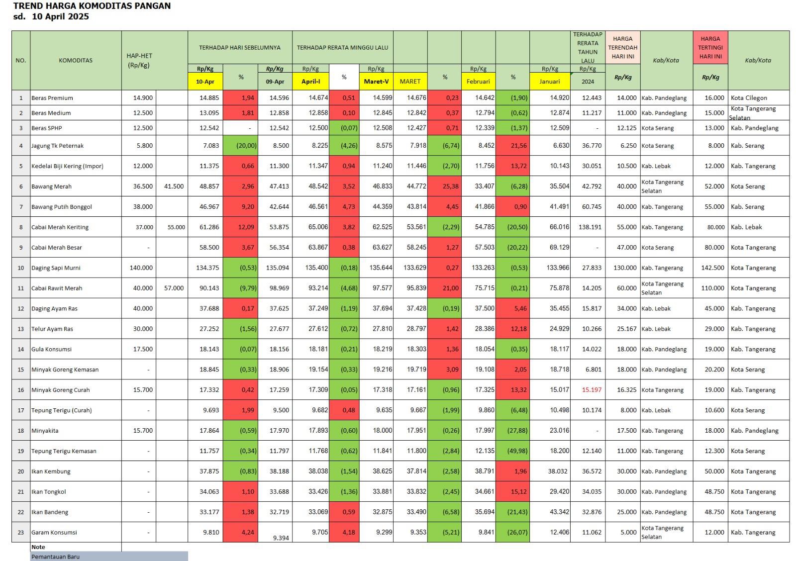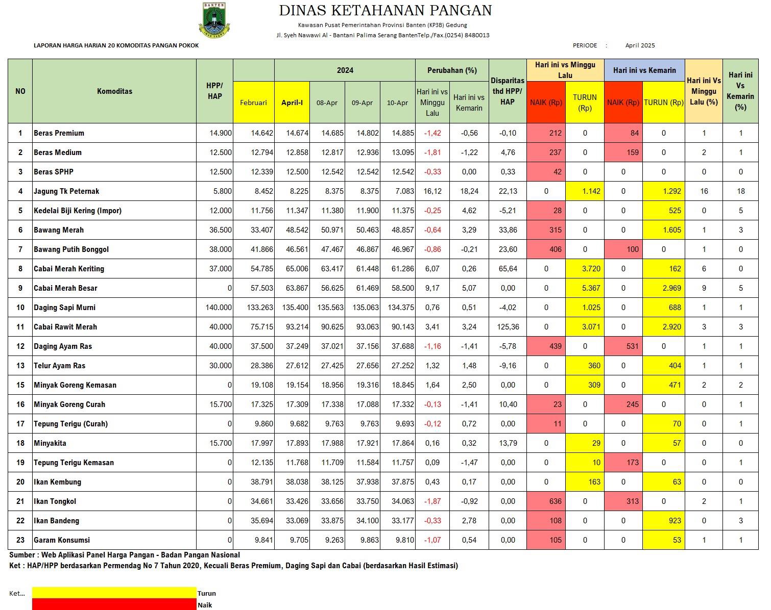 Dilihat dari laporan harian, hari Kamis 10 April 2025 dibanding dengan hari Rabu 9 April 2025 terdapat 7 komoditas yang mengalami kenaikan dan 14 komoditas penurunan, kenaikan yang paling signifikan adalah Komoditas Daging Ayam Ras hingga Rp. 531 atau 1,41% dari hari kemarin Sedangkan komoditas yang mengalami penurunan signifikan adalah Komoditas Cabai Merah Besar sebesar Rp. 2.969. Atau sebesar 5,07% dari harga sebelumnya. Sedangkan komoditas lainnya mengalami harga yang stabil.