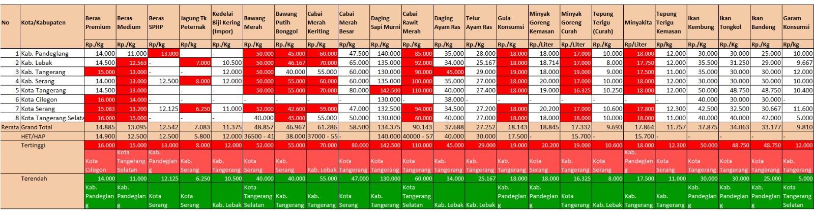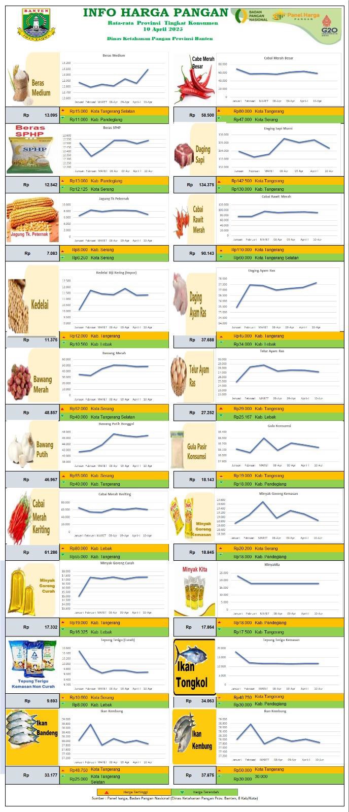 Pada Hari Kamis Minggu Pertama Bulan April, dari 23 komoditas apabila melihat rata-rata minggu lalu terdapat 10 komoditas yang mengalami kenaikan harga dibanding harga pada minggu lalu yaitu 1. Beras Premium, 2. Beras Medium, 3. Kedelai Biji Kering (impor), 4. Bawang Merah, 5. Bawang Putih Bonggol, 6. Cabai Merah Keriting, 7. Cabai Merah Besar, 8. Tepung Terigu Curah, 9. Ikan Bandeng, 10. Garam Konsumsi. Kenaikan paling tinggi adalah Komoditas Bawang Putih Bonggol sebesar 4,73% (harga sebelumnya Rp. 44.359 menjadi Rp. 43.888 Harga tertinggi berada di Kab Serang dan terendah di Kabupaten Tangerang. Sementara untuk harga yang turun (penurunan harga) ada 13 komoditas yaitu: 1. Beras SPHP, 2. Jagung Tk Peternak, 3. Daging Sapi Murni, 4. Cabai Rawit Merah, 5. Daging Ayam Ras, 6. Telur Ayam Ras, 7. Gula Konsumsi, 8. Minyak Goreng Kemasan, 9. Minyak Goreng Curah, 10. Minyak Kita, 11. Tepung Terigu Kemasan, 12. Ikan Kembung, 13. Ikan Tongkol. Penurunan Harga yang paling signifikan adalah komoditas Cabai Rawit Merah sebesar 4,68% harga sebelumnya adalah Rp. 97. 577 menjadi Rp. 93.214 dengan harga terendah di Kota Tangerang Selatan dan Harga tertinggi di Kota Tangerang.