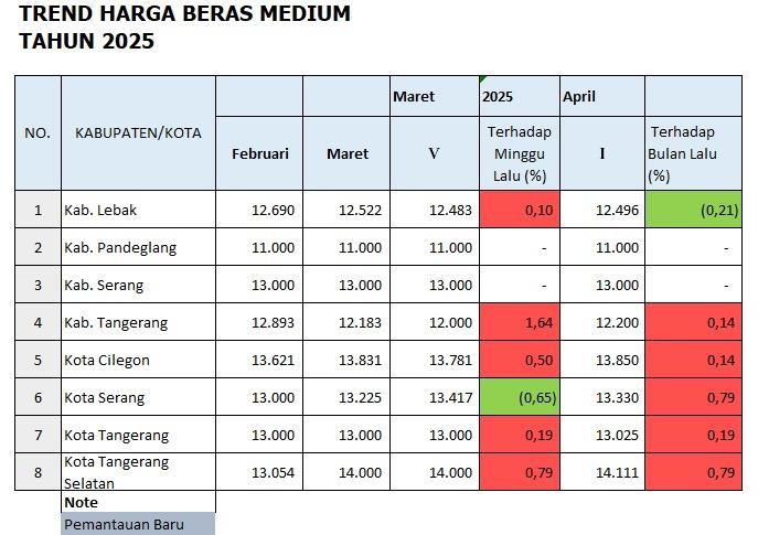 Apabila melihat trend harga Beras Medium minggu pertama Bulan April dibandingkan dengan harga Minggu Lima Bulan Maret, Kab Kota yang mengalami kenaikan harga adalah Kab Lebak, Kab Tangerang, Kota Cilegon, Kota Tangerang, dan Kota Tangerang Selatan Dimana kenaikan paling signifikan ada di Kab Tangerang sebesar 1,64% dari harga Rp. 12.000 menjadi Rp. 12.200. Sedangkan Kab Kota yang mengalami penurunan harga Kota Serang dengan penurunan harga sebesar 0,65% dari harga Rp. 13.417 menjadi Rp. 13.330, sedangkan Kab Kota Lainya mengalami harga yang stabil.