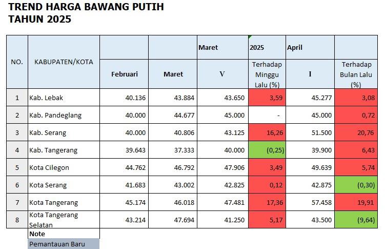 Apabila melihat Apabila melihat trend harga Bawang Putih minggu pertama Bulan April dibandingkan dengan harga Minggu Lima Bulan Maret, Untuk kenaikan harga terdapat di Kabupaten Lebak, Kab Serang, Kota Cilegon, Kota Serang, Kota Tangerang dan Kota Tangerang Selatan. Kenaikan harga paling signifikan ada di Kota Tangerang sebesar 17,36% dari harga Rp. 47.481 menjadi Rp.57.458. Sedangkan Penurunan harga ada di Kabupaten Tangerang sebesar 0,25 % dari Rp. 40.000 menjadi 39.900 untuk Kab/Kota lainnya mengalami harga yang stabil.