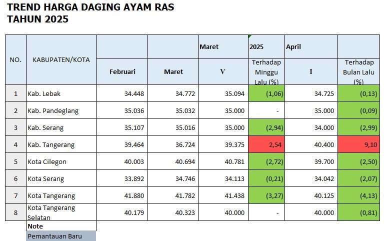 Apabila melihat Apabila melihat trend harga Daging ayam minggu pertama Bulan April dibandingkan dengan harga Minggu Lima Bulan Maret, Kabupaten/Kota yang mengalami kenaikan harga adalah Kab Tangerang dengan kenaikan Sebesar 2,54% dari harga Rp. 39.375 menjadi Rp. 40.400, Sedangkan penurunan harga terjadi di Kab Lebak, Kab Serang, Kota Cilegon, Kota Serang dan Kota Tangerang Dimana penurunan paling signifikan ada di Kota Tangerang sebesar 3,27% dari harga Rp. 41.438 menjadi Rp. 40.125. Sedangkan Kab Kota lainnya mengalami harga yang stabil.